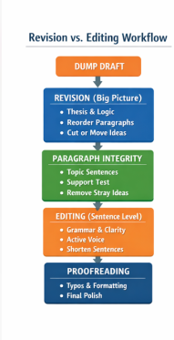 Revision is the crucial part of editing that includes ‘big-picture’ changes like altering the main idea or topic, reorganizing the order of body paragraphs, evaluating the sentence structure, incorporating more vivid examples, or modifying the structure of the whole paper. It also involves detailed changes like making the word choice perfect, changing a passive voice into an active voice, eliminating redundancies, and fixing grammar and spelling errors.