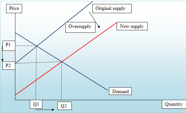 The phenomenon of oversupply led to the increase in production and a fall in prices which can be explained using following diagram.