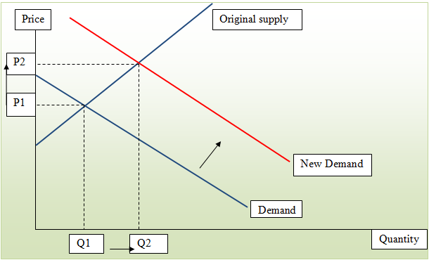 The above diagram shows that price is measured in Y axis and quantity in X axis. The lines marked in blue are the original demand and the supply curves. P1 is the original price of coffee and Q1 is the quantity demanded and supplied of coffee at price P1. Now since the demand of coffee increased the demand curve of coffee shifted to its right. The reason for the shift was that the demand increased not due to the change in price was due to new coffee markets emerging. The new demand curve is marked in red in the above diagram. Now since the supply for coffee did not change with the change in demand, the price for coffee increased. The supply curve is the original curve and the demand curve is the new curve. The prices increased from P1 to P2 and the quantity of coffee increased from Q1 to Q2. The demand of coffee outstripped the supply which led the prices to rise after 2004 (Topik 2015).