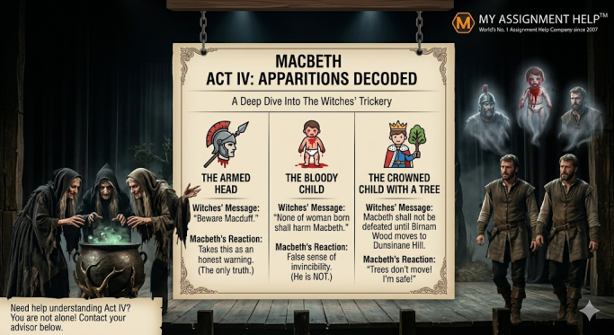 If you’re stuck on your assignment about Act IV, don’t worry—this part is confusing for everyone. In this act, the Witches show Macbeth three “Apparitions” (ghostly visions). Each one is a trick.